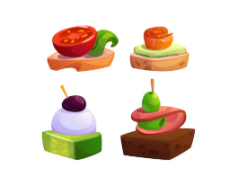Poulet tikka et tomate marinée Jambon Serrano et fromage frais piquillos. Thon fumé/ sésame et sauce soja.
